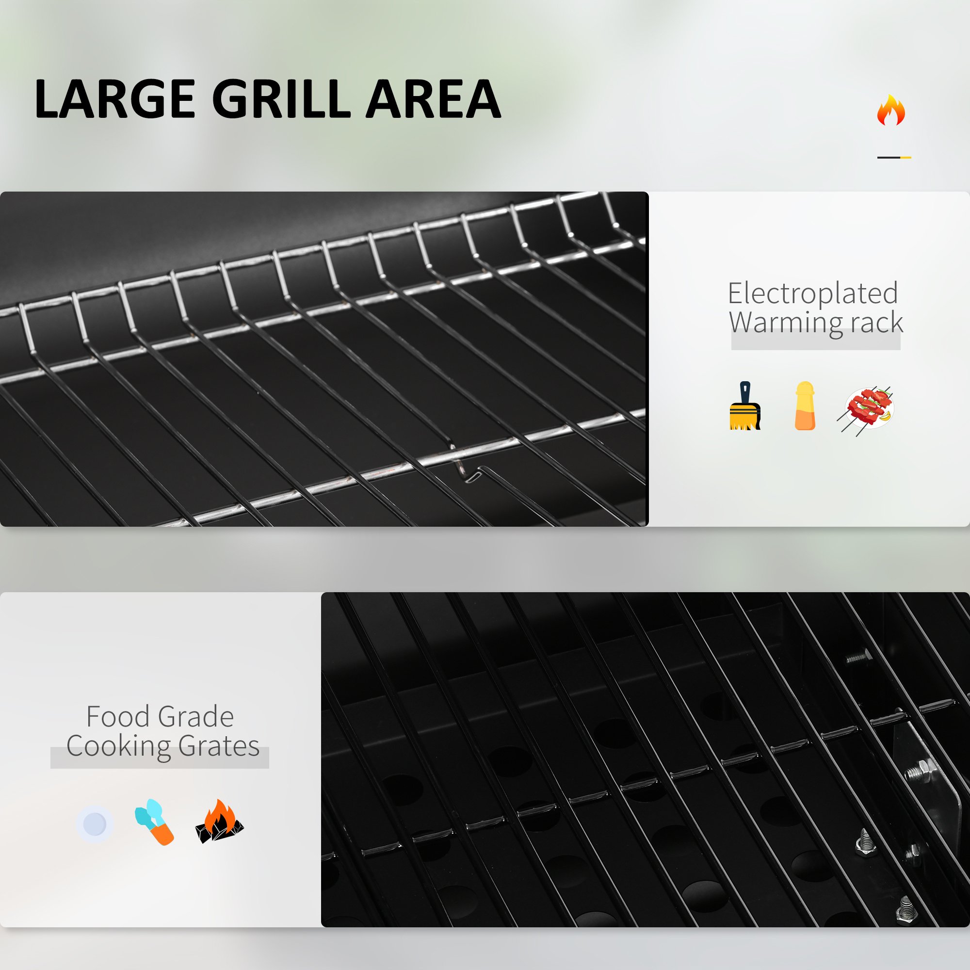 Charcoal Grill: Invite over friends for dinner and show off your skills. Our charcoal BBQ grill features a spacious 21.75" x 16.5" surface and a second layer to act as a warming rack, letting you feed a whole party.