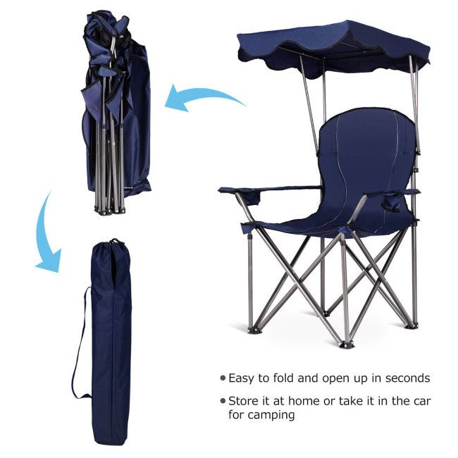 Sets up quickly and packs easily back into its carry bagUse a durable heavy-duty steel stable frame, more stable constructionThe design with canopy keeps your skin a glowing, healthy complexionIdeal for outside uses such as beach, picnic, fishing and football gamesSturdy foot pad is fine workmanship, good antiskid effect, protecting the chair from flipping overTwo cup holder provides you best convenient to store snacks and cool drinksIt provides you a comfortable lying with high quality fabrics and ergonomic backrest construction