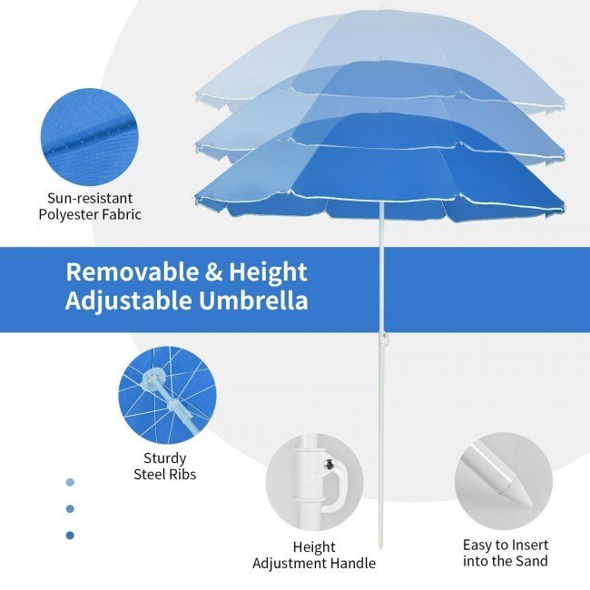 Umbrella with fade-resistant and waterproof polyester fabric for sun-protectionEasy to insert into the sand because of the pointed bottom of the umbrella poleMeets your different needs thanks to its height adjustable umbrellaIf you want to sunbath, just remove the umbrella based on your demandsCooler bag within the mini table to keep your drinks stay coldEasy to access your drinks with beverage holders on both sidesSide pocket for storing magazines or other items easilyWaterproof oxford cloth and anti-rust steel frame for outdoor useAnti-slip foot pads and sturdy X-shaped frame for strong stabilityFoldable design and included bag for easy carrying and storageSuitable for patio, backyard, poolside and beach, etc