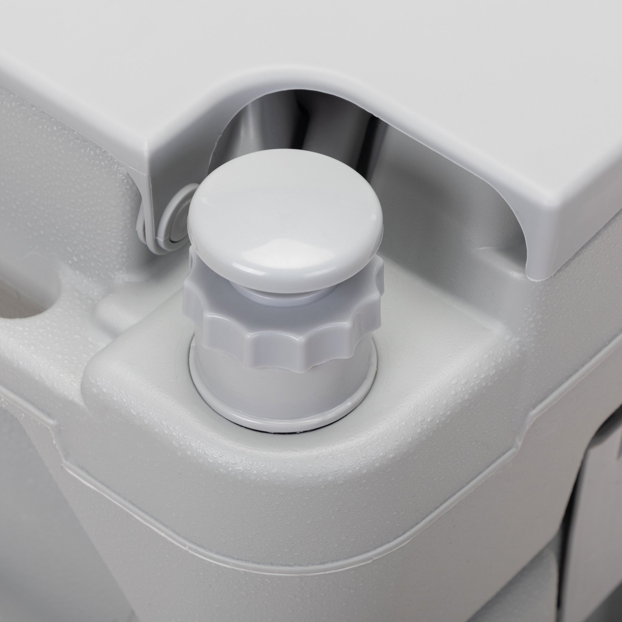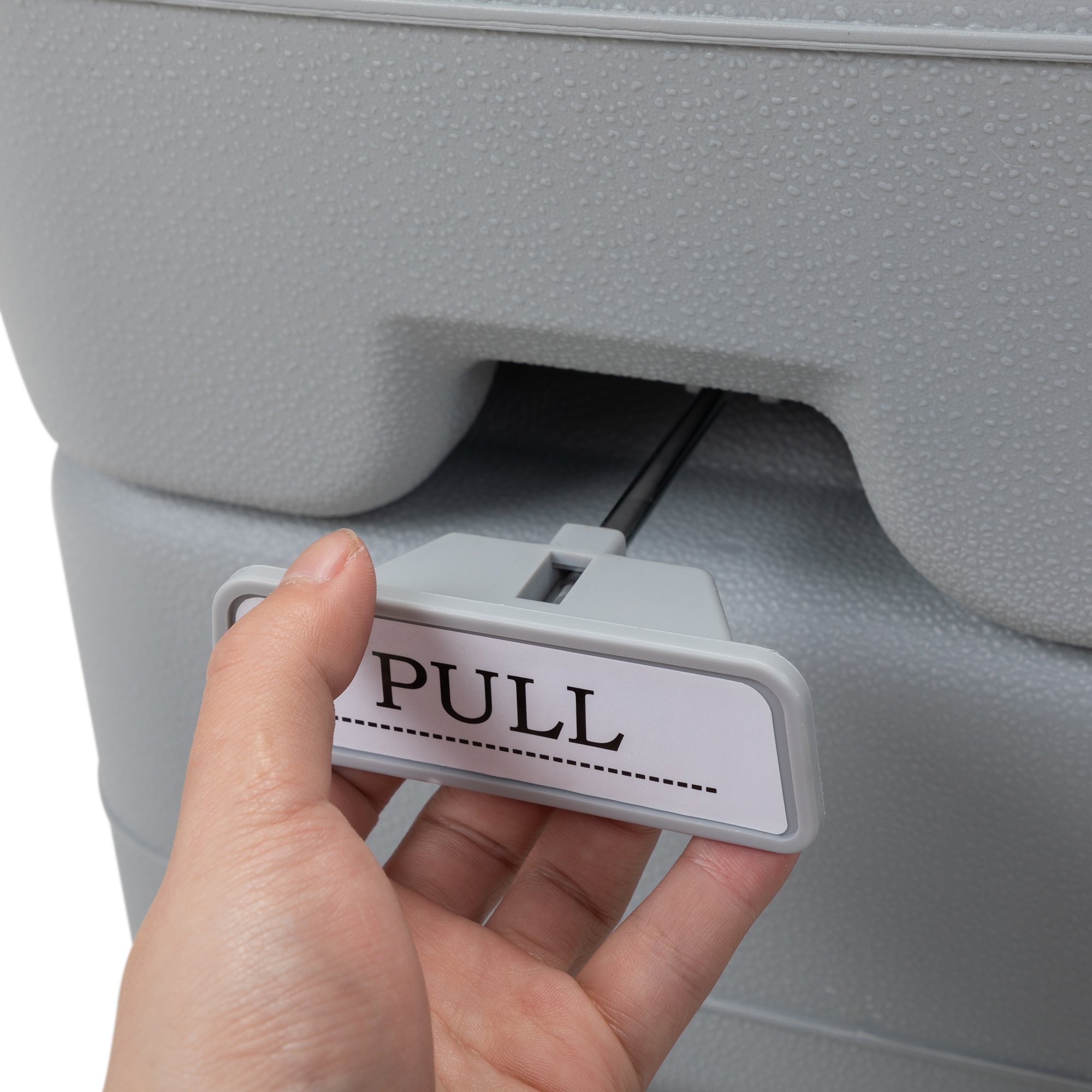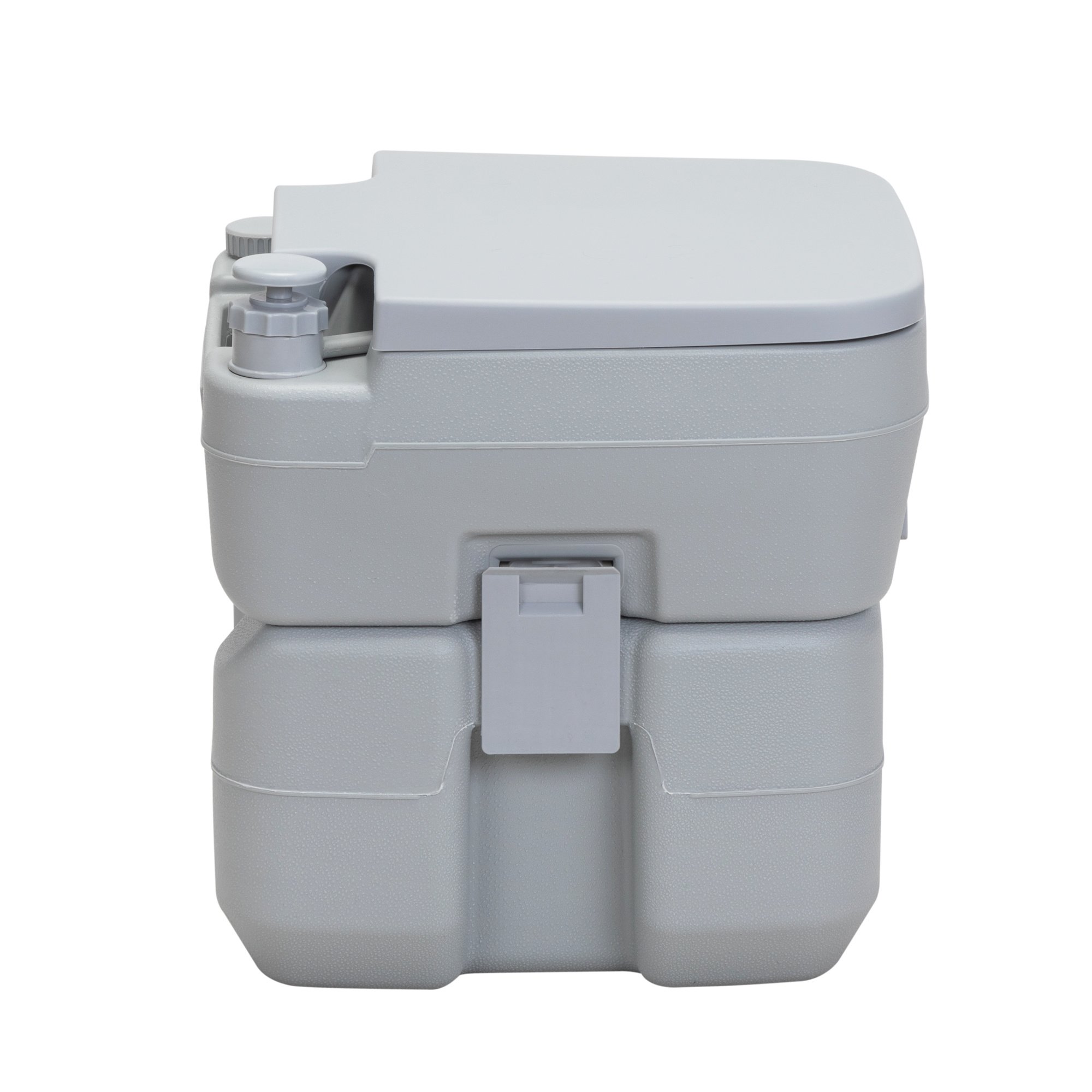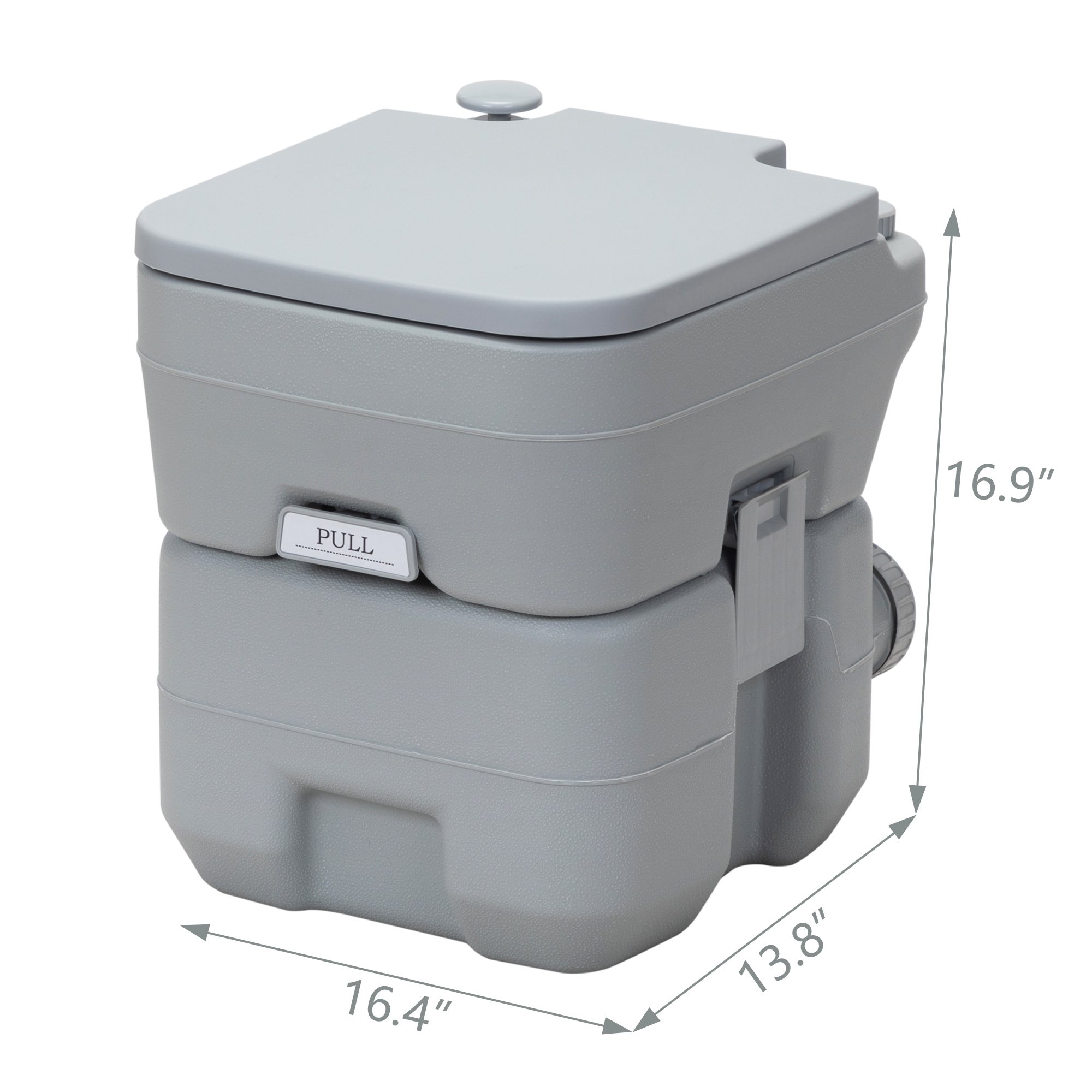 Features:[Versatile Outdoor Toilet]: Featuring 2 side handles, this lightweight and compact toilet is easy to move, suitable for camping, travel, RV, boat and more.[Leak-proof Design]: The toilet is made of upgraded HDPE and connected by sturdy latches, ensuring maximum odor isolation with high hygiene.[Easy to Clean]: An improved ring water outlet ensures powerful cleaning action and the detachable waste tank (5.3 gallon) doesn't need to be emptied frequently.[Carry Bag Included]: Coming with a storage bag for you to carry this porta potty in a more convenient way.[Ready to Use]: No assembly, external fresh water or power connections are required, greatly saving your time and energy. Specifications:Color: GrayMaterial: HDPEProduct Dimensions: 13.8"L x 16.3"W x 16.9"HToilet Seat Dimensions: 13.2"L x 13.8"WCarry Bag Dimensions: 14.2"L x 16.5"W x 16.9"HCapacity of Water Tank: 3.2 gallonCapacity of Waste Tank: 5.3 gallonWeight Capacity: 440 lbsNet Weight: 10.6 lbs