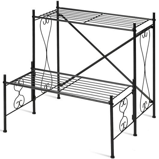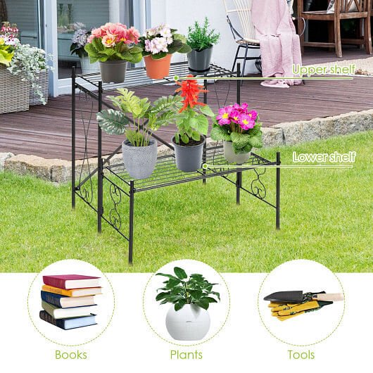 Designed with 2-tier shelf this plant rack offers ample space for all your stuff such as plants flowers pots shovels and more. Your plants will enjoy enough sunlight due to the vertical design and perfect height. Thanks to its suitable gaps you don't have to worry about plants falling accidentally. And the sturdy metal construction with durable black powder coated finish promises long-lasting use. What' more you can move and install this lightweight plant stand without much effort. This attractive and space-saving flower pot holder is a perfect tool to decorate your backyard garden living room patio and more. Create a perfect home layout and organize your plants with this sophisticated 2-layer flower stand!