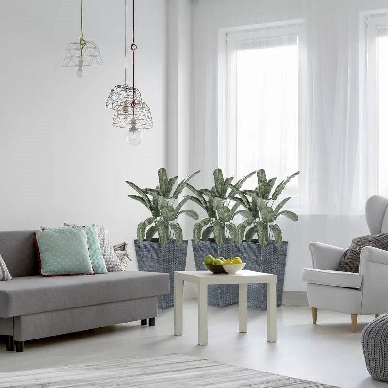 This Set of 3 - Grey Faux Rattan Plastic Tall Large Flower Pots give your space a classic modern touch! The rattan-style plastic makes it easy to get plants settled inside and allows you to drill holes at the bottom for water drainage if they are placed outside. Add some new life to any backyard, living, or office space with this set of 3 flower boxes.
